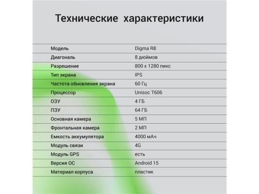 Планшет Digma R8 T606 (1.6) 8C RAM4Gb ROM64Gb 8" IPS 1280x800 4G Android 15 темно-серый 5Mpix 2Mpix BT WiFi microSD 512Gb 4000mAh 168hrs