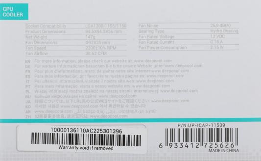 Система активного охлаждения Deepcool CK-11509 предназначена для установки на процессоры с сокетами Intel (S775S1150/S1155/S1156). Кулер имеет 3-х пиновый разъем для управления, в связи с чем вентилятор работает только на одной частоте вращения 2200 оборотов в минуту. Одновременно с этим устройство Deepcool CK-11508 представляет собой малошумящий аппарат, так как его уровень шума составляет всего 26,8 дБ. Охлаждающие системы для процессоров, товарной марки DEEPCOOL являются довольно качественными, удобными и производительными устройствами, которые при этом можно приобрести по низкой цене.