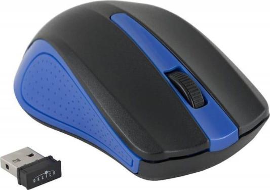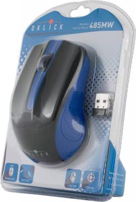Oklick 485MW относится к типу оптических беспроводных мышей. Она выполнена в черном и голубом цвете. Верхняя часть мыши, на которую обычно кладется ладонь, имеет покрытие софт-тач. Боковины мыши чуть сдавлены внутрь, для того, чтобы вы могли удобно разместить большой палец. Чтобы он не скользил производитель сделал покрыл эту поверхность небольшими точками. Благодаря симметричной конструкции Oklick 485MW могут пользовать как левши, так и правши.