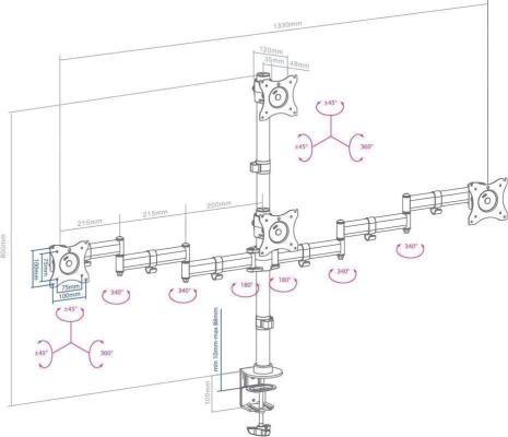 Мониторы на кронштейнах можно: вращать на 360° в горизонтальных плоскостях, наклонять вверх и вниз, и поворачивать влево и вправо.