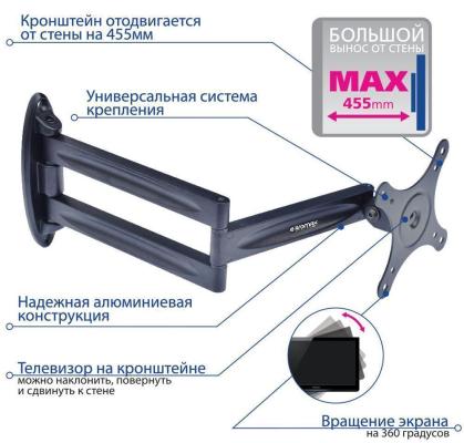 При всей своей кажущейся простоте, кронштейн в действительности - девайс крайне важный, к выбору которого нужно подходить ответственно. Высокое качество материалов - гарантия того, что ваш дорогостоящий телевизор никогда не выскользнет из пазов. Красивый дизайн, не портящий интерьер. Ну и, конечно же, возможность наклона и поворота экрана для более комфортного пользования.