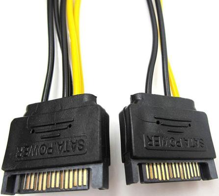 Тип штекера устройства - 2 x SATA 15 pin «M» - PCI-Ex 8 pin. Подключить переходник питания можно таким образом: 2 x SATA 15pin (Male) - подключаются к блоку питания ПК, а PCI- Ex 8pin (Female) - подключается к разъему питания видеокарты / Разборный разъем 6+2 pin.