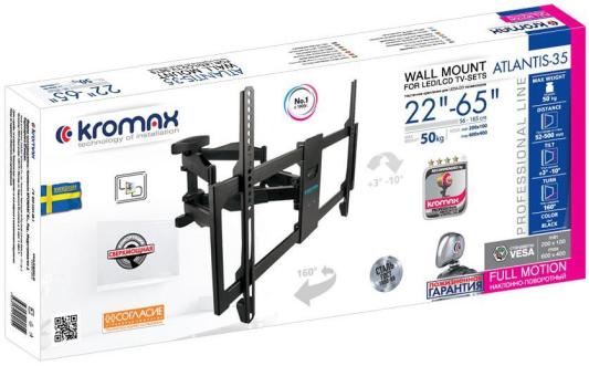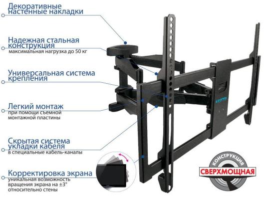 Данный кронштейн совместим с дисплеями в диапазоне от 22 до 65 дюймов и позволяет наклонять экран в диапазоне +3°/-10°, а также поворачивать 160°. Максимально допустимый вес - 50 кг.