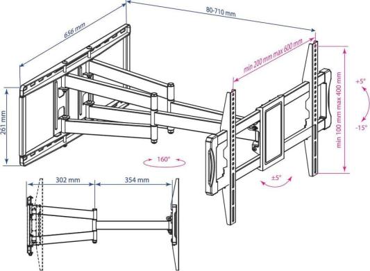 Аксессуар совместим с девайсами весом до 101 килограмма и обладающими диагональю от 32 до 75 дюймов. Закрепленный в пазах телевизор можно наклонять в диапазоне +5°/-15° и поворачивать на 160°. Также в данном кронштейне предусмотрен кабель-канал, с помощью которого можно будет спрятать все шнуры.